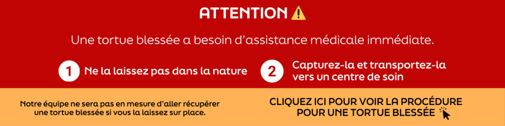 Attention! Une tortue blessée a besoin d’assistance médicale immédiate. Ne la laissez pas dans la nature, capturez-la et transportez-la vers un centre de soin. Notre équipe ne sera pas en mesure d’aller récupérer une tortue blessée si vous la laissez sur place.
