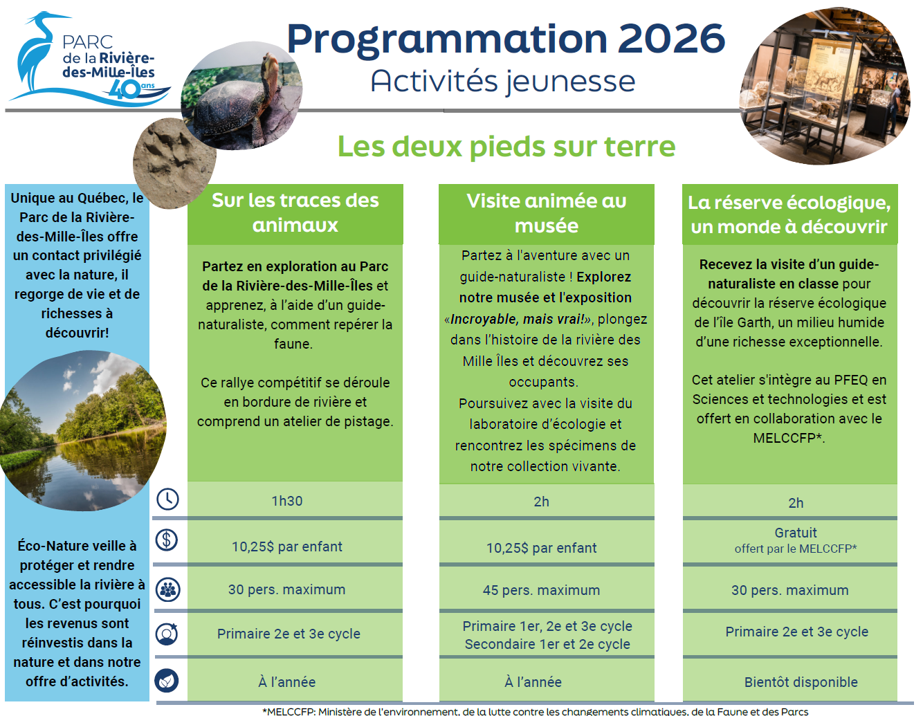 Unique au Québec, le Parc de la Rivière-des-Mille-Iles offre un contact privilégié avec la nature, il regorge de vie et de richesses à découvrir! Éco-Nature veille à protéger et rendre accessible la rivière à tous. C’est pourquoi les revenus sont réinvestis dans la nature et dans notre offre d’activités.
